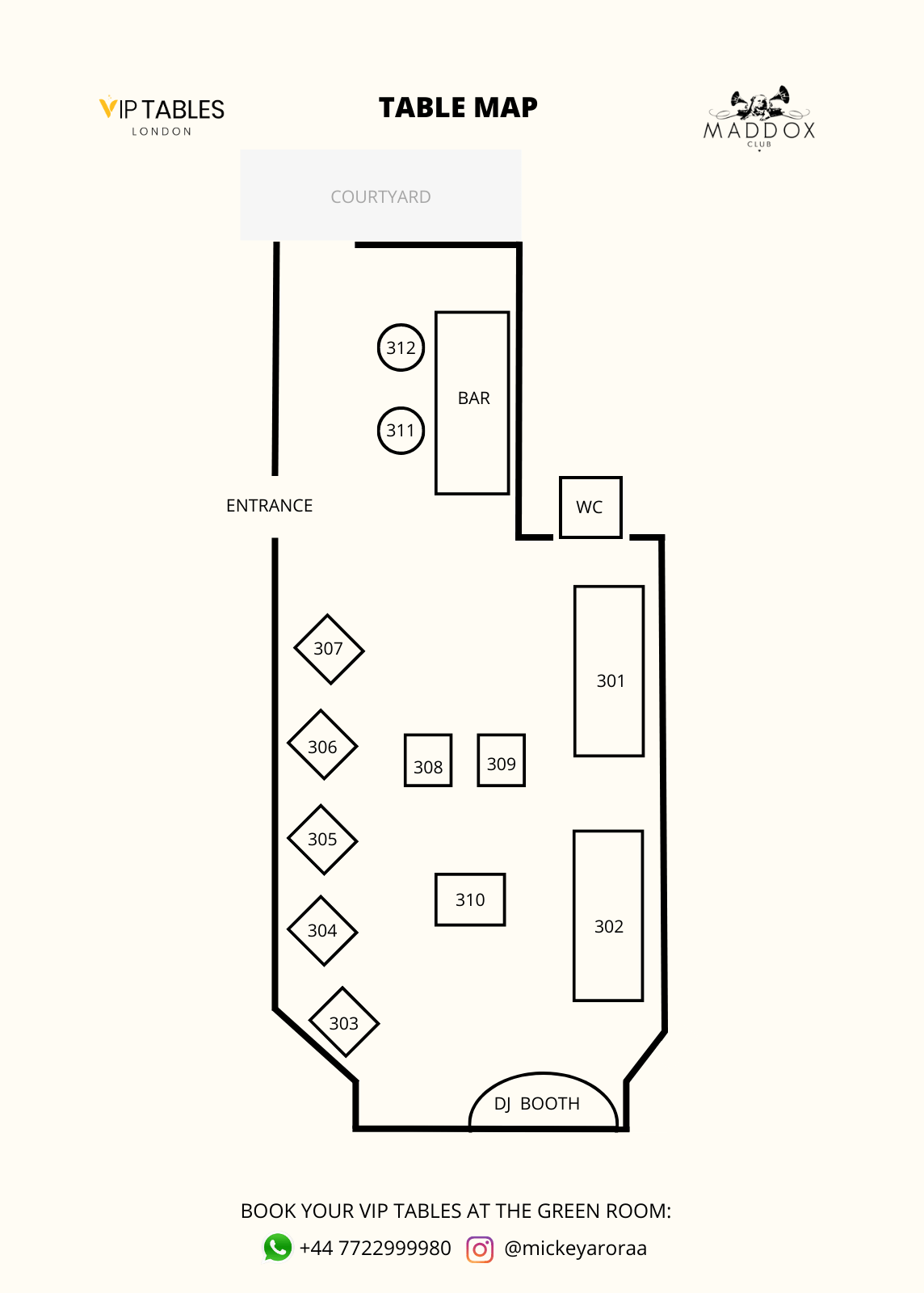 The Green Room has two types of tables, The Standard and The VIP. For mixed groups, the first one has a price of £1000 minimum spend for groups of up to 10 people, and the VIP is £1500 minimum spend for groups of up to 10 guests.