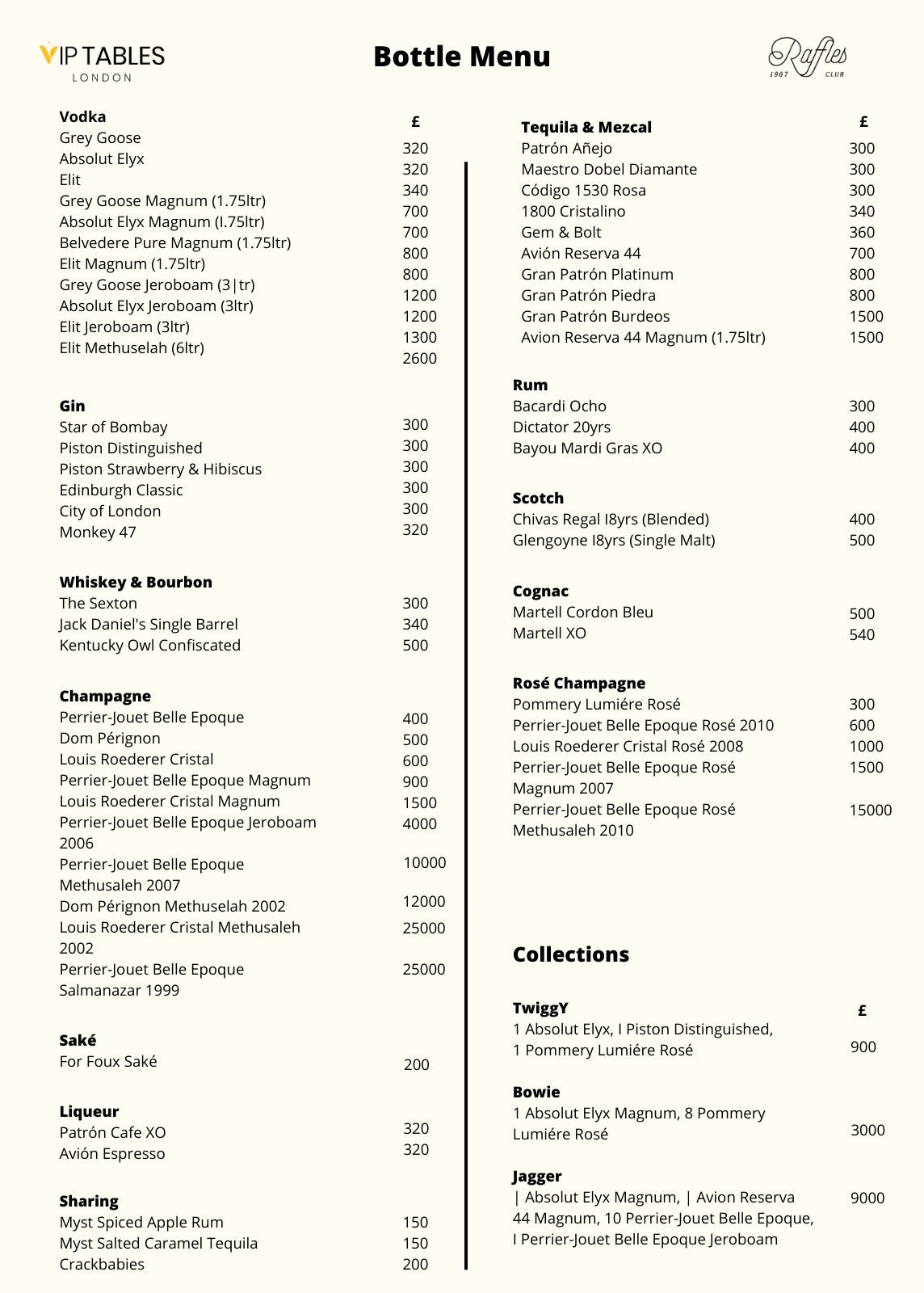 For Table Booking, there are two types of tables at Raffles, The Standard and The VIP. For mixed groups, the first one has a price of £500 minimum spend for groups of up to 3 people and £1000 minimum spend for groups of up to 10 guests. The second table has a £1000 minimum spend for groups of up to 3 guests and £2000 minimum for groups of up to 10.