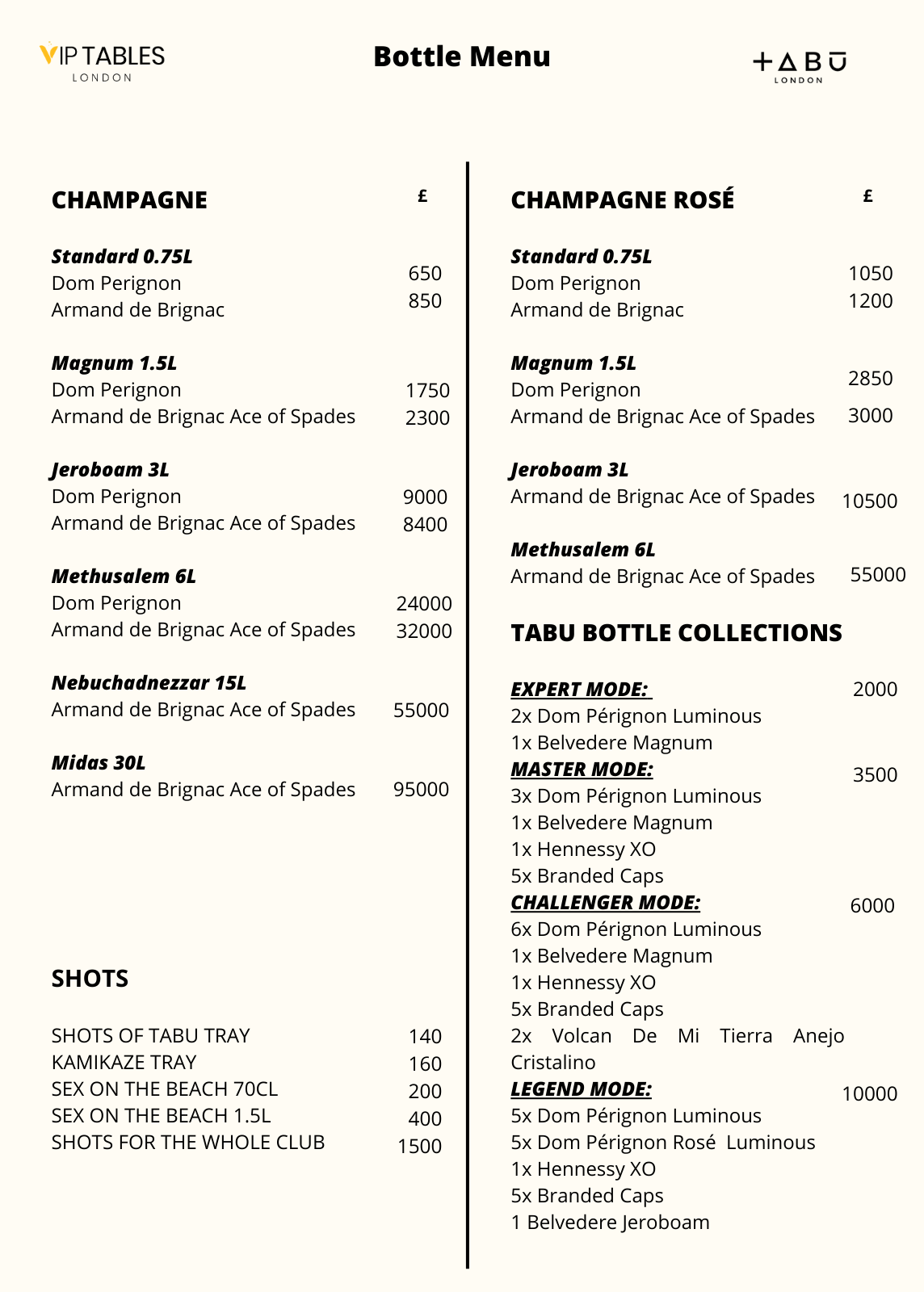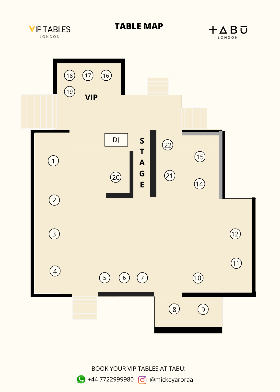 Tabu table prices begin at £1.5k minimum for groups of up to eight. VIP Table prices start at a minimum of £2500. Fees for entry of £20 apply when making a table reservation at Tabu. In the upstairs Tabu, tables are open with no minimum expenditure.