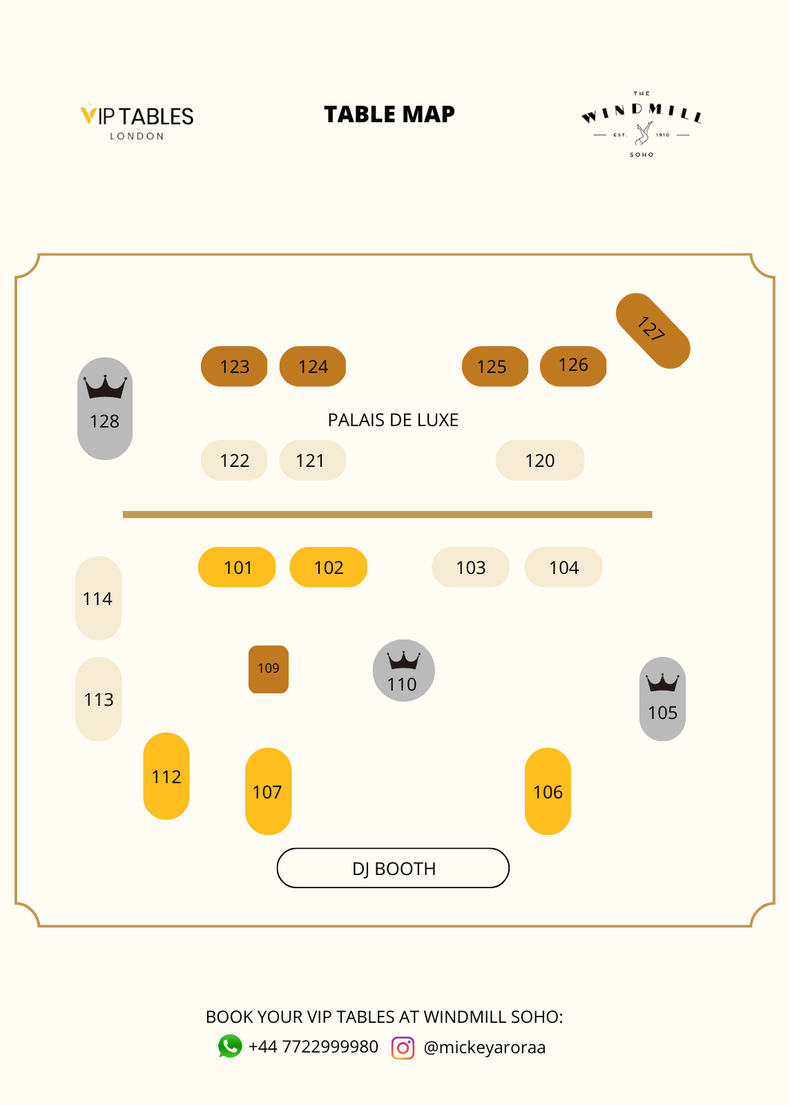 The Windmill Soho has two types of tables: The Standard and The VIP. For mixed groups the first one has a price of £1000 minimum spend for groups of up to 10 people, and the VIP is £2000 minimum spend for groups of up to 10 guests.
